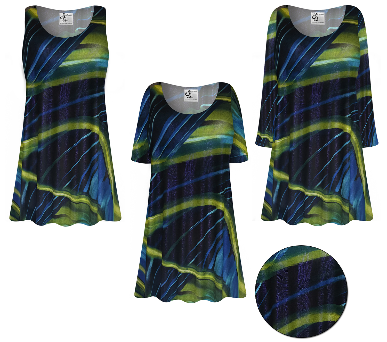 NEW! Plus Size Iridescent Lagoon Slinky Top Tunics Tanks Blouses 1x - 9xEffortlessly stylish and comfortable, this women's A-Line swing top features an array green, blue, and black colors topped with a beautiful purple shimmer. Designed with plus size women in mind this fabric drapes beautifully over the body, creating a flattering silhouette for everyday wear.