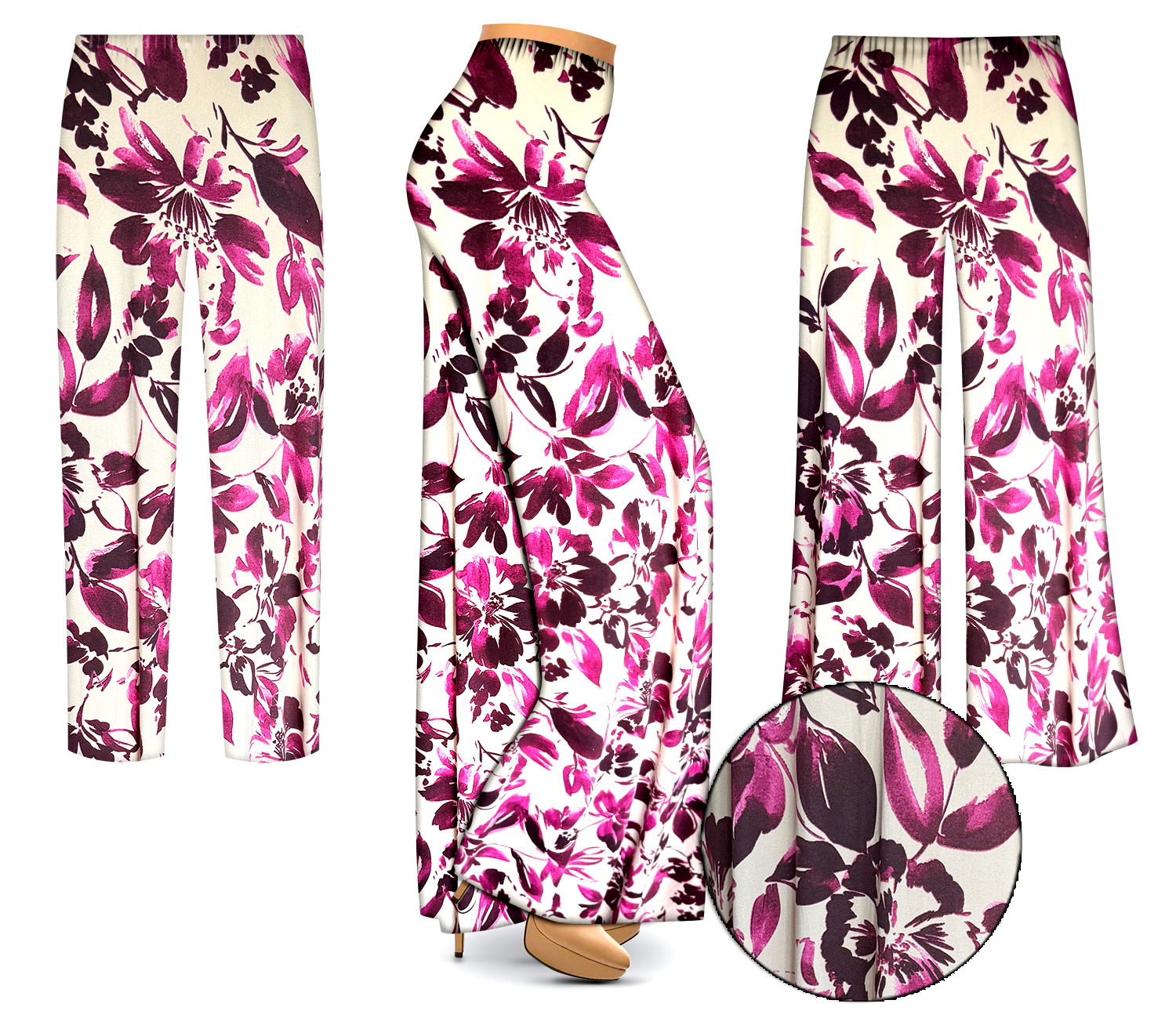 These beautiful plus size pants are a must-have for your wardrobe! As always, our rayon fabric is uber comfy! These ultra soft brushed jersey print plus size elastic waist pants are available in straight leg, tapered, gaucho / wide leg palazzo pants, and come in either full or capri length.