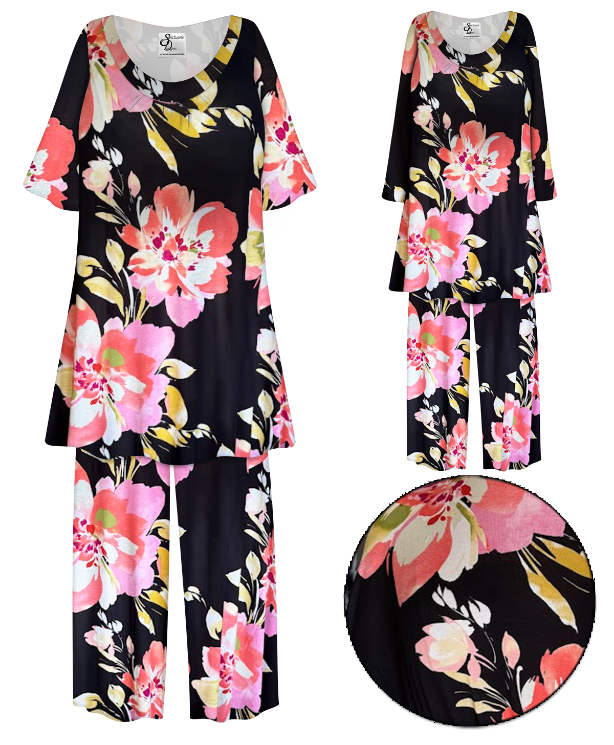 Indulge in the perfect blend of style and comfort with our Large Pink Flowers Rayon Pajama set. This luxurious two-piece set features a breezy, relaxed -fit top and matching full-length pants, both crafted from ultra soft brushed jersey material. Available in Standard or Tall lengths in roomy sizes 0x 1x 2x 3x 4x 5x 6x 7x 8x & 9x! Length measurements