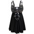 Plus size women's swim dress with straps, a sweetheart neckline and a front tie for an ultra feminine look. This swim dress has elastic at the empire waist, black skirt, extra roomy hips, and it comes with either plain bottoms (bottoms are a separate piece, not connected) or plain swim shorts (for a little extra).