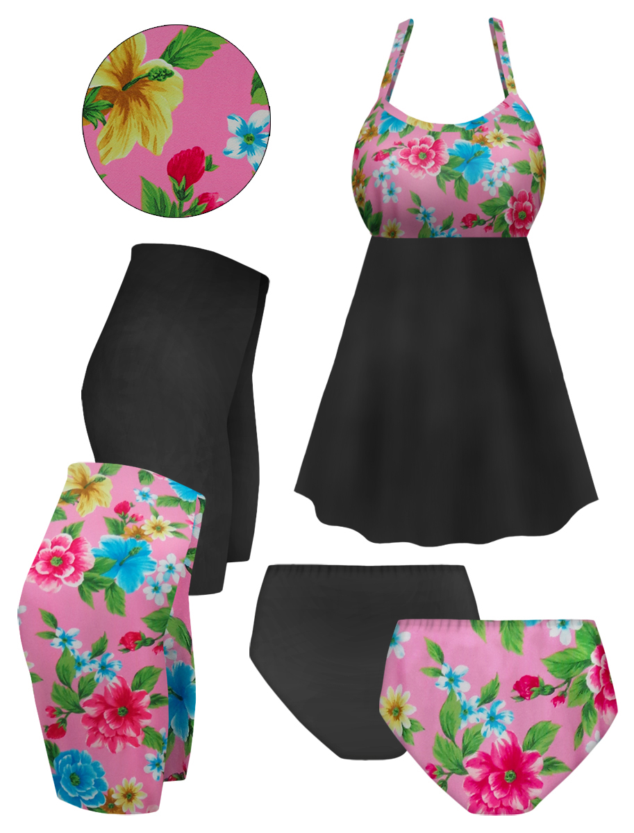 SOLD OUT! CLOSEOUT CLEARANCE! Plus Size I'm Happy Print Two-Piece Babydoll Swimdress 4x This is a lovely plus size & supersize babydoll swimsuit (swimdress). It has a floral print top, empire waist, black skirt, extra roomy hips and comes with matching bottoms. ** NOTE: Unlike other swim dresses, ours can also be worn with pants or a skirt so it looks simply like a top over them. This means you can dress for dinner with the swimsuit, coordinating pants and a jacket, and afterwards, drop your pants and jacket by the pool and dive in for a swim!