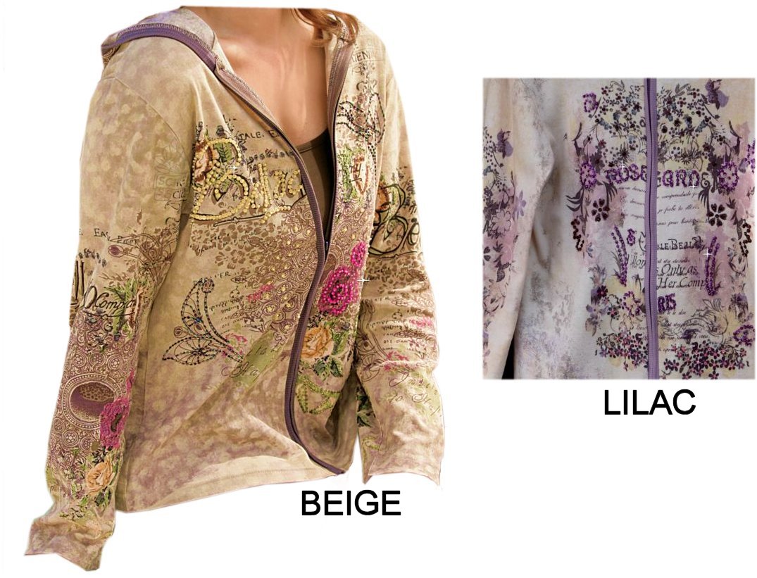 SOLD OUT!!!CLEARANCE! Stylish Plus-Size Beige or Lilac Screen Print Zip Up JacketWeekend fun begins in this jacket embellished with a vintage screen print and bead trim. Zip front, hood and long sleeves. Machine-washable; 100% Cotton; Imported.