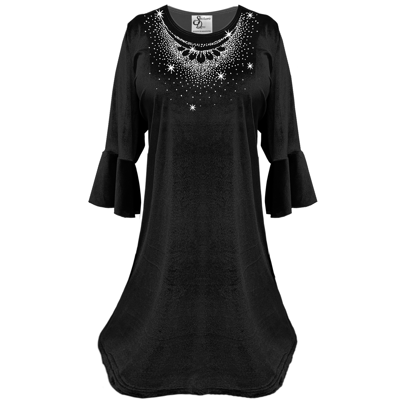 SOLD OUT! Plus Size Black Smooth Velvet with Rhinestud Rhinestones Womens Dress CustomizableThe Sanctuarie Black Smooth Velvet with Rhinestud Rhinestones Fabric Dress invites you to take a Winter night stroll and its ideal for a fun night out in town! Smooth Velvet with Rhinestud Rhinestones fabric shapes this flirty flow dress. A comfort fitting top with long bell sleeves is the perfect match for a long flowing skirt to finish this essential winter warm look. Available in customizable lengths from Petite to XX-Long in sizes Sm Med Lg XL 0x 1x 2x 3x 4x 5x 6x 7x 8x & 9x! Length measurements are taken from the top of the shoulder down.
