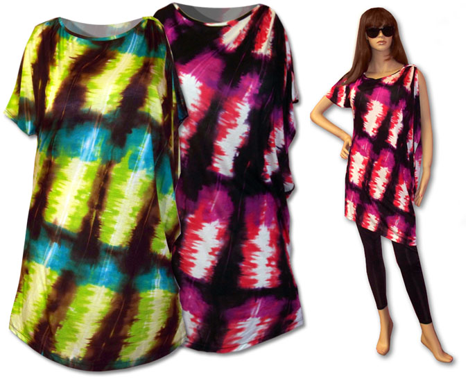 SOLD OUT! SALE! Beautiful Tie Dye Asymmetrical Plus Size Tunics 1x 2x 3xWe love these new tunics! They are ultra soft and come in two beautiful prints (pink/black/white & green/blue/brown). The have a slightly assymetrical design-one side has a cap sleeve and one side exposes teh shoulder. These tunics are loose and flowing around the chest, stomach and hips. Perfect with a pair of jeans or a leggings for a fun, fresh new look!