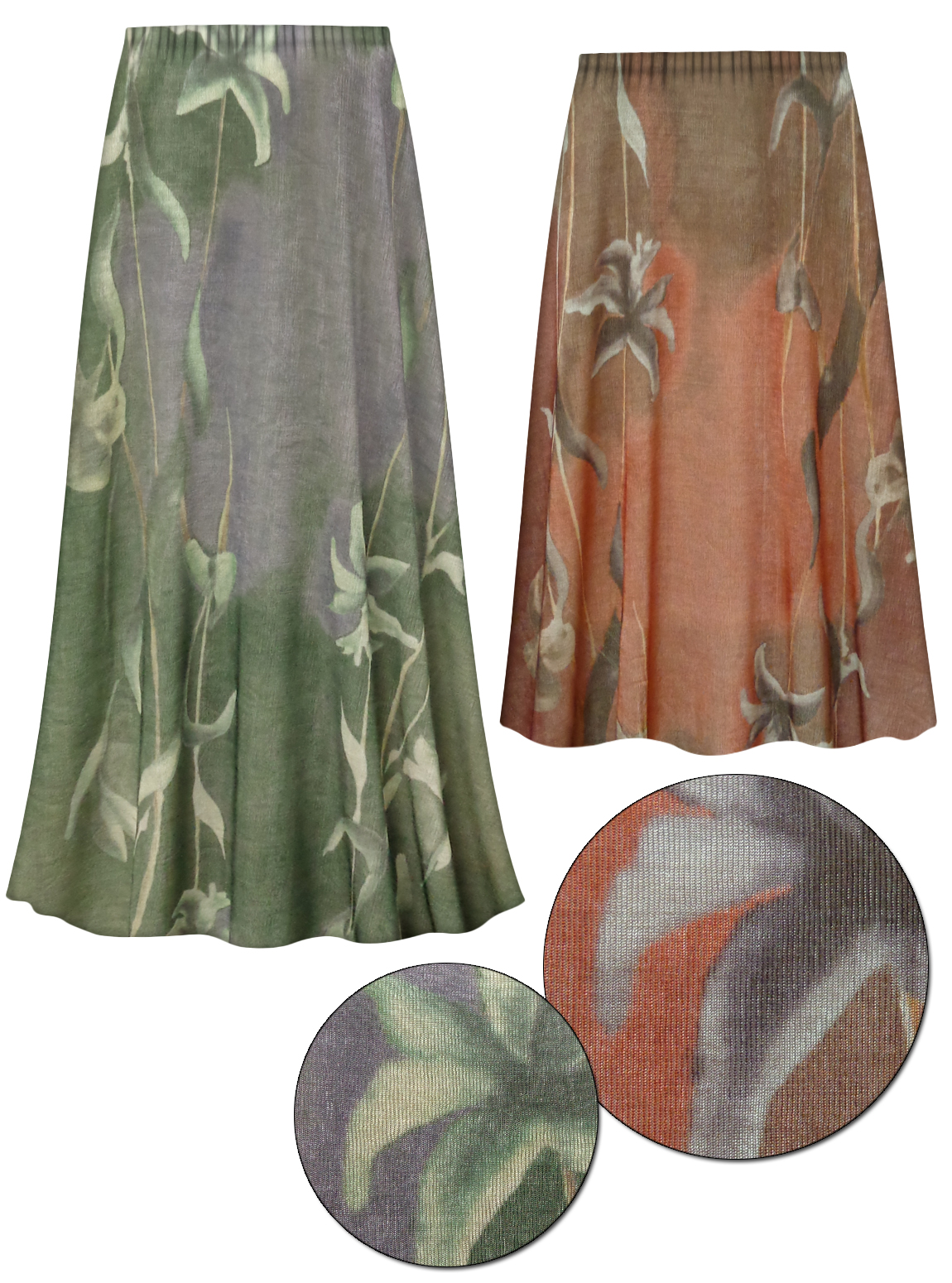SOLD OUT! Customizable Plus Size Green or Brown Lilies Slinky Print Skirts - Sizes Lg XL 1x 2x 3x 4x 5x 6x 7x 8x 9xThese are fabulous bright and vibrant lightweight stretchy