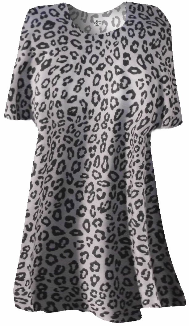SOLD OUT! SALE! Gray & Black Leopard Print Plus Size & Supersize Extra Long T-Shirts 8xThis fabulous print is a lightweight poly/cotton blend, and is available in oversize a-line t-shirts, sizes 3x up to 8x (check measurements below). They're standard A-line, with short sleeves, and a round neckline. Extra long at appx 38"-40"! Check the measurements below, if you usually wear a 6x, you might just find you're a 3x or 4x in these, but always check measurements listed to be sure.) The fabric is a machine washable waffle/ribbed medium weight poly/cotton jersey, with lots of stretch!