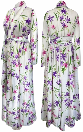 NEW! Ultra Soft Brushed Jersey Violet Breeze Print Plus Size & Supersize Retro Style Dressing Gown / Hostess Robes 1x-9x Sanctuarie Exclusive! Wrap yourself in vibrant comfort with our Ultra Soft Brushed Violet Breeze Print Robe. Designed for both elegance and ease, this robe features a lush tropical floral print bursting with bold colors-- perfect for lounging or making a stylish statement at home.