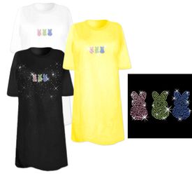 SOLD OUT! SALE! 3 Bunny Peeps Sparkly Rhinestud Rhinestones Plus Size & Supersize T-Shirts S M L XL 2x 3x 4x 5x 6x 7x 8x 9x (All Colors)Approximate Image Size: 5.5" x 2.5"