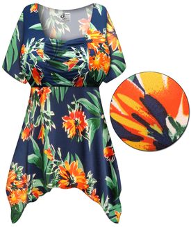 SOLD OUT! Customizable Plus Size Navy & Orange Tropical Floral Slinky Print Babydoll Top 0x 1x 2x 3x 4x 5x 6x 7x 8x