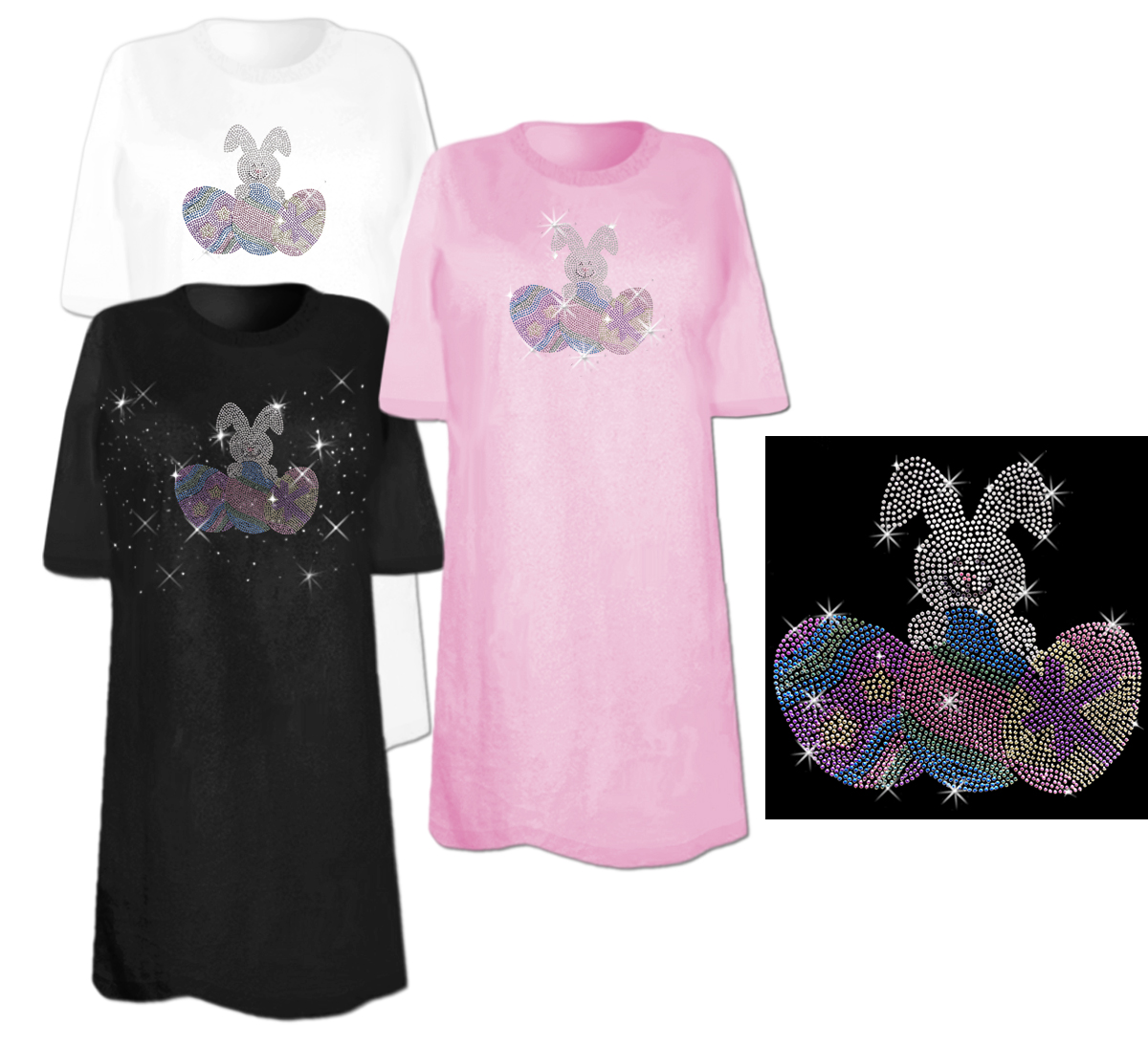 SOLD OUT! SALE! Easter Bunny & Eggs Sparkly Rhinestud Rhinestones Plus Size & Supersize T-Shirts S M L XL 2x 3x 4x 5x 6x 7x 8x 9x (All Colors)Approximate Image Size: 8" x 7.2"
