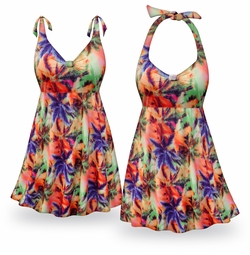 CLOSEOUT CLEARANCE! Palm Sunset Print Halter Style Plus Size Swimsuit / SwimDress 2x/3x