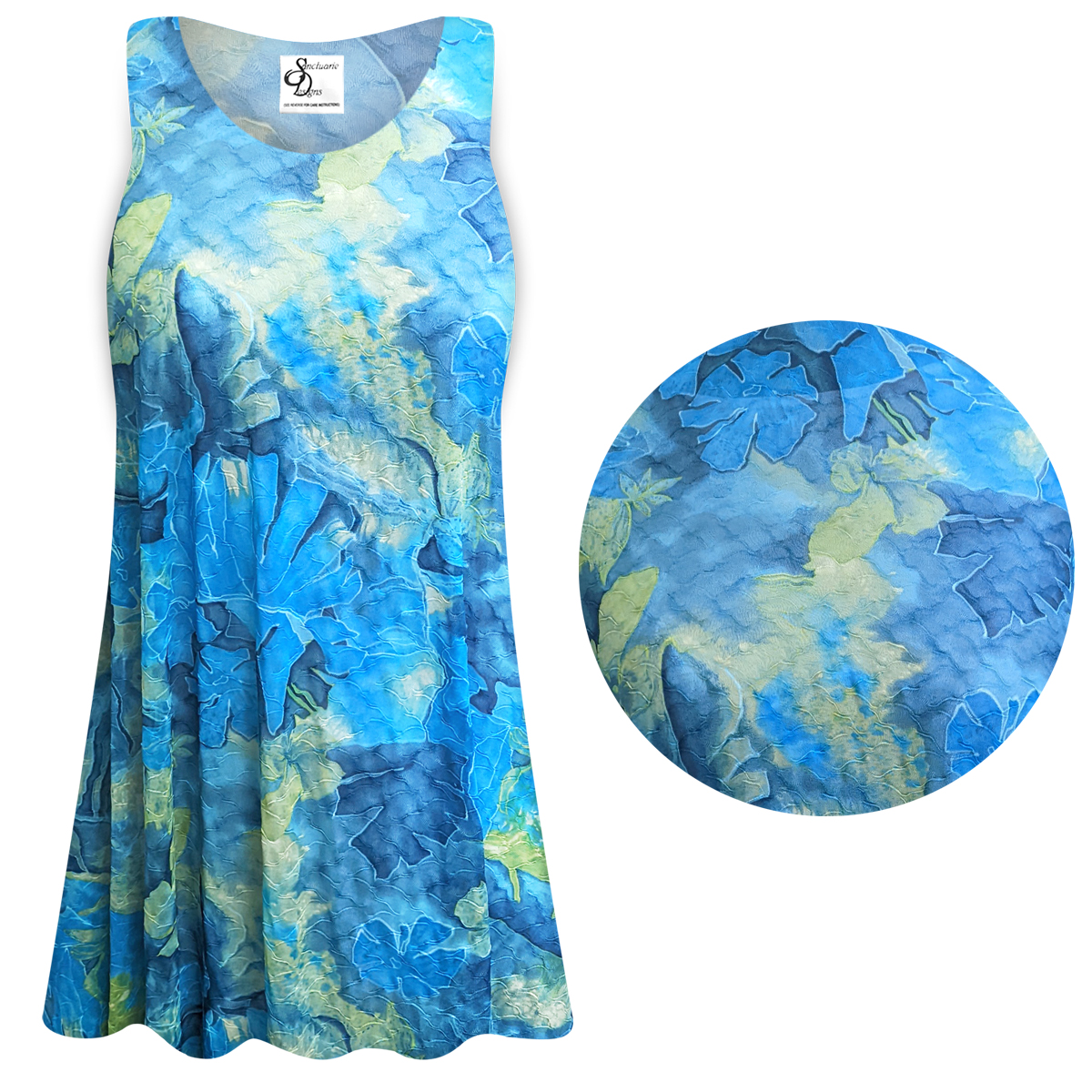SOLD OUT! Plus Size Blue Oasis Extra Long Womens Ultra Soft TopsMeet the top that will be the talk of any party, the Sanctuarie Design Blue Oasis Top! This cute top features an Exclusive Blue Oasis Print in a Rayon Challis fabric that sweep across this fabulous top as it shapes a round crew neckline in a sleeveless option. Light gathering at the fabulous print tops this great plus size top design before ending at a flaring peplum-inspired round hem. Available in either standard a-line or princess-cut styles; (click here for a-line / vs / princess cut style descriptions) in sizes Sm Med Lg XL 0x 1x 2x 3x 4x 5x 6x 7x 8x & 9x! Available in customizable lengths from Petite to XX-Long. Length measurements are taken from the top of the shoulder down.